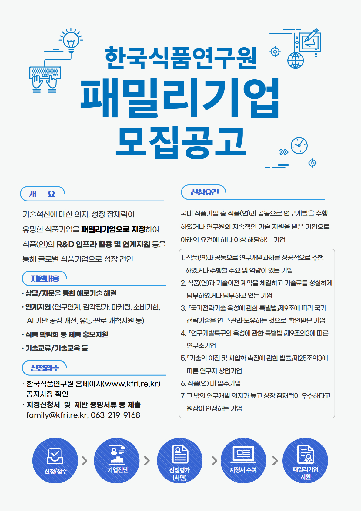 한국식품연구원 기업솔루션연구센터에서는 국내 식품기업 중 기술혁신에 대한 의지, 성장 잠재력 및 보유기술 등을 종합적으로 고려하여 패밀리기업으로 지정하고 연구원이 보유하고 있는 R&D 인프라(기술, 노하우, 연구장비 및 정보 등)를 활용하여 연구원-패밀리기업 간 혁신 시너지 창출 및 글로벌 식품기업으로 성장할 수 있도록 지원하고 있습니다. 이에, 2025년도 신규 패밀리기업을 모집공고 하오니 관심있는 기업의 많은 참여 바랍니다.